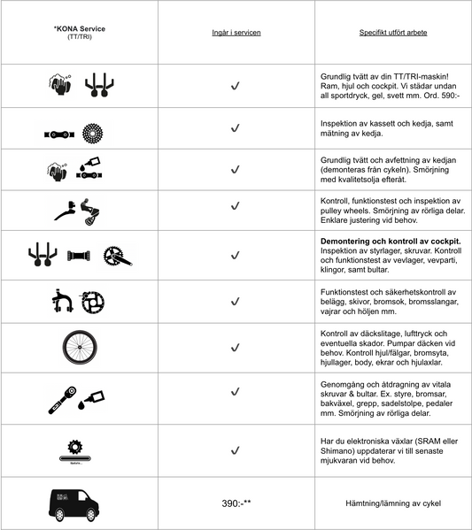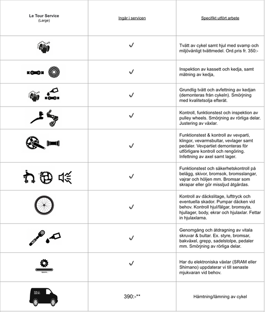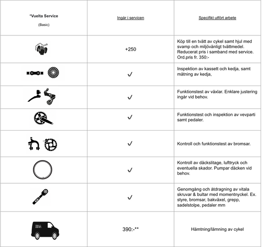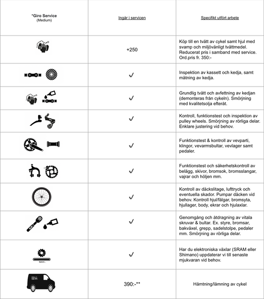 En välskött cykel kommer alltid att vara säkrare, snabbare och roligare att cykla på. Slösa inte på dina hårt inarbetade watt! Låt oss få ut max av din cykel, så du kan prestera på topp! Boka ett servicepaket nu!